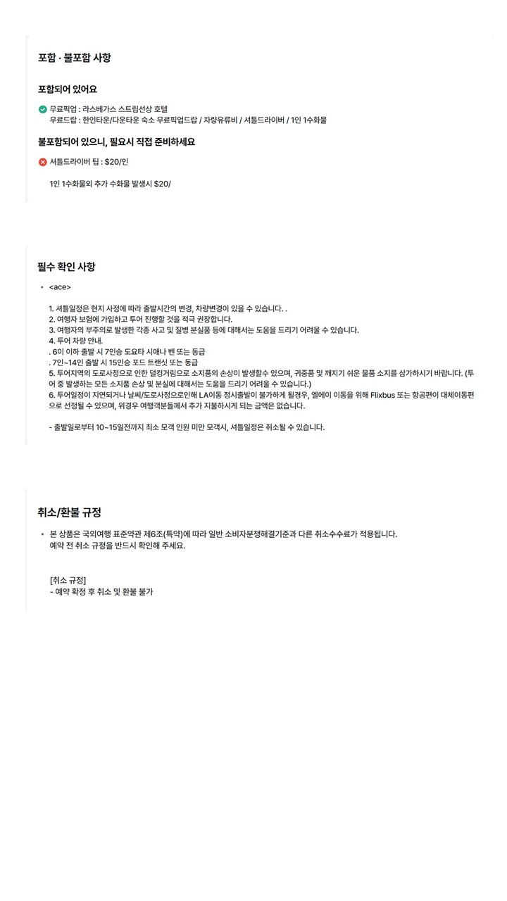 각 항목별로 예약금(공항 20불 / 디즈니랜드 20불 / 기타지역 10불) 결재, 잔금은 현장에서 지불